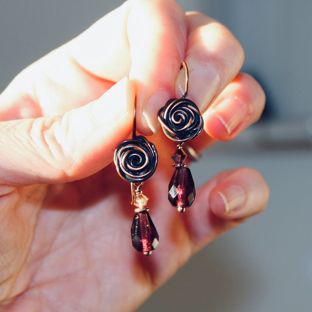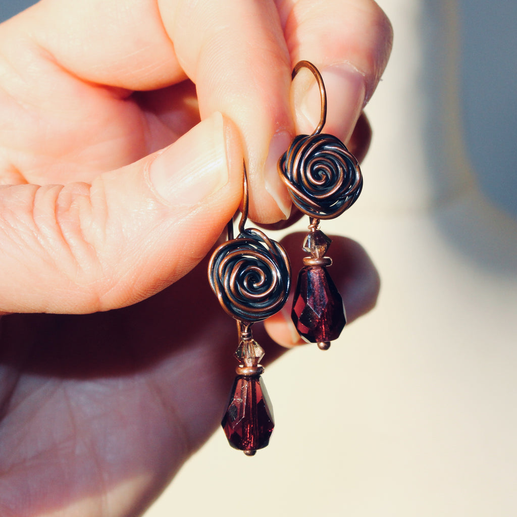 Delicate Glasgow rose earrings in rosy copper with deep amethyst coloured, fire-polished Czech glass drops and faceted crystals with and copper ear wires.
