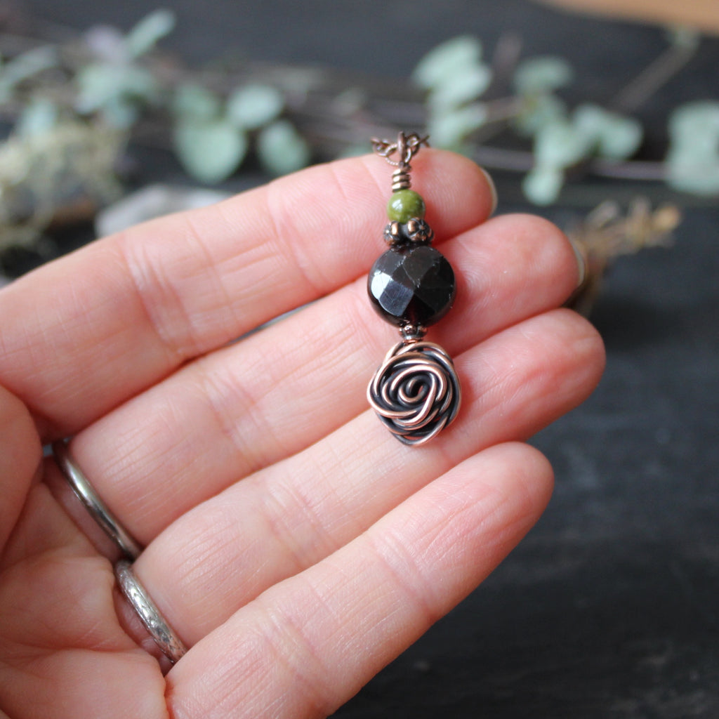 - An earthy pendant of garnet and unakite, this is a delicate version of my cantrip pendants