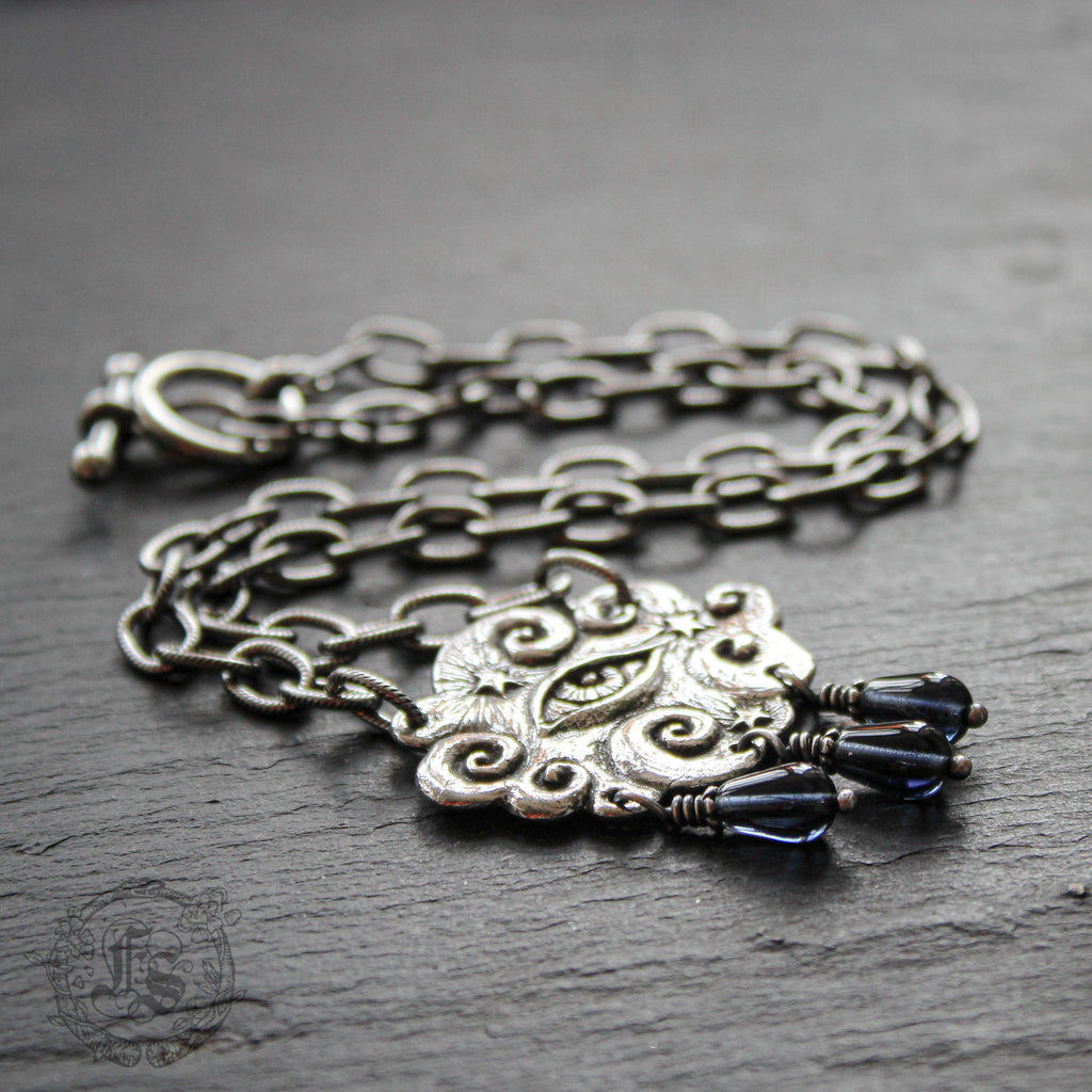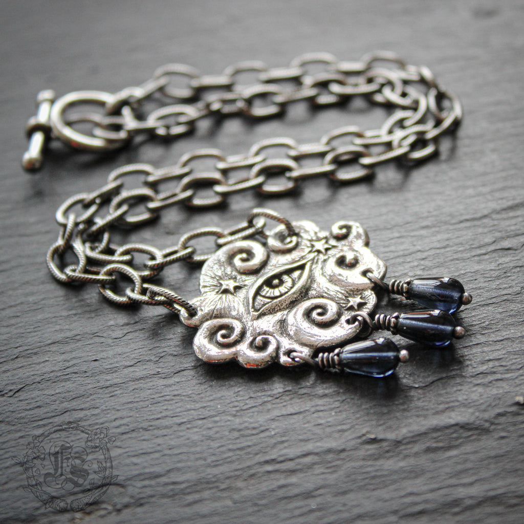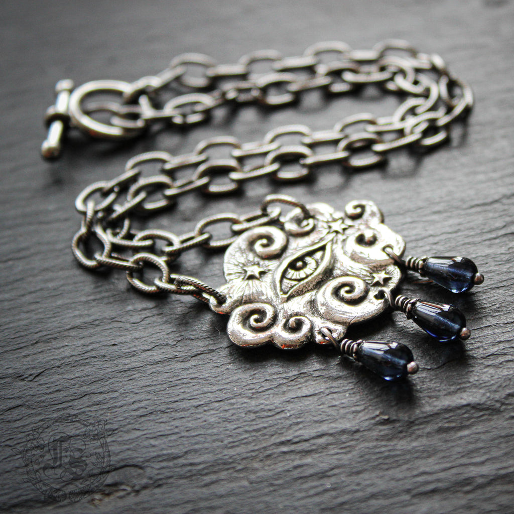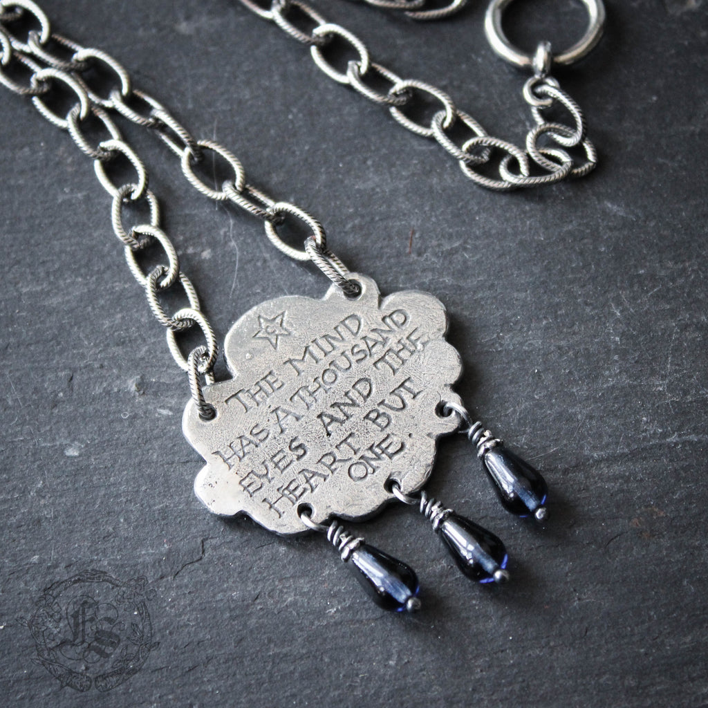 A graceful cloud statement necklace with all seeing eye peering out. The back of the pendant is inscribed: "The mind has a thousand eyes and the heart but one."