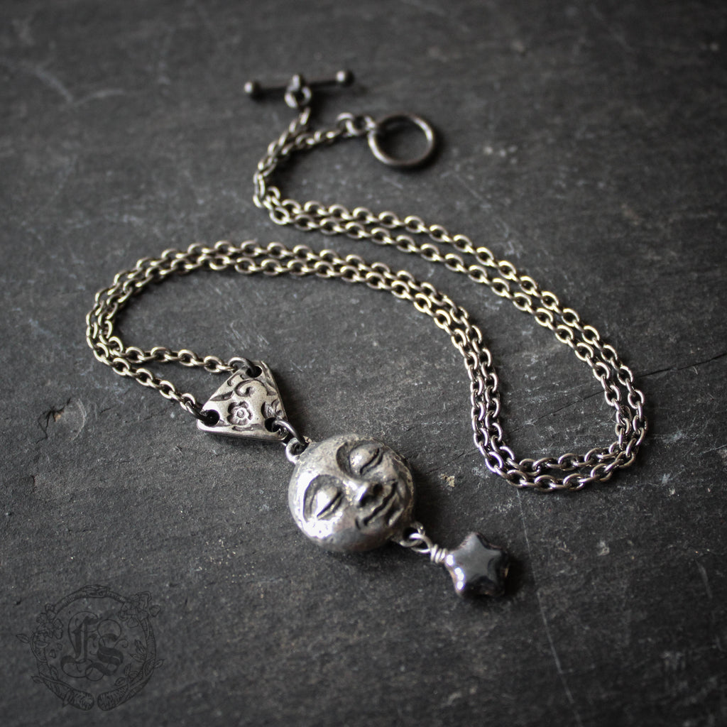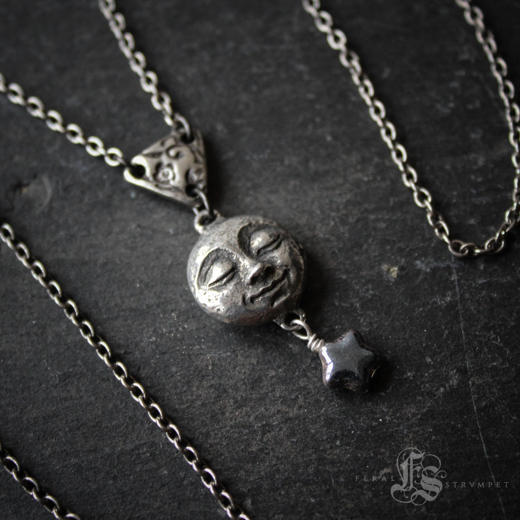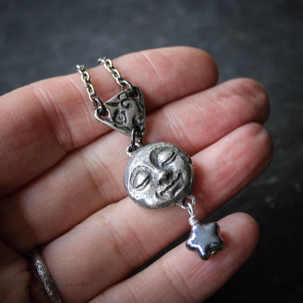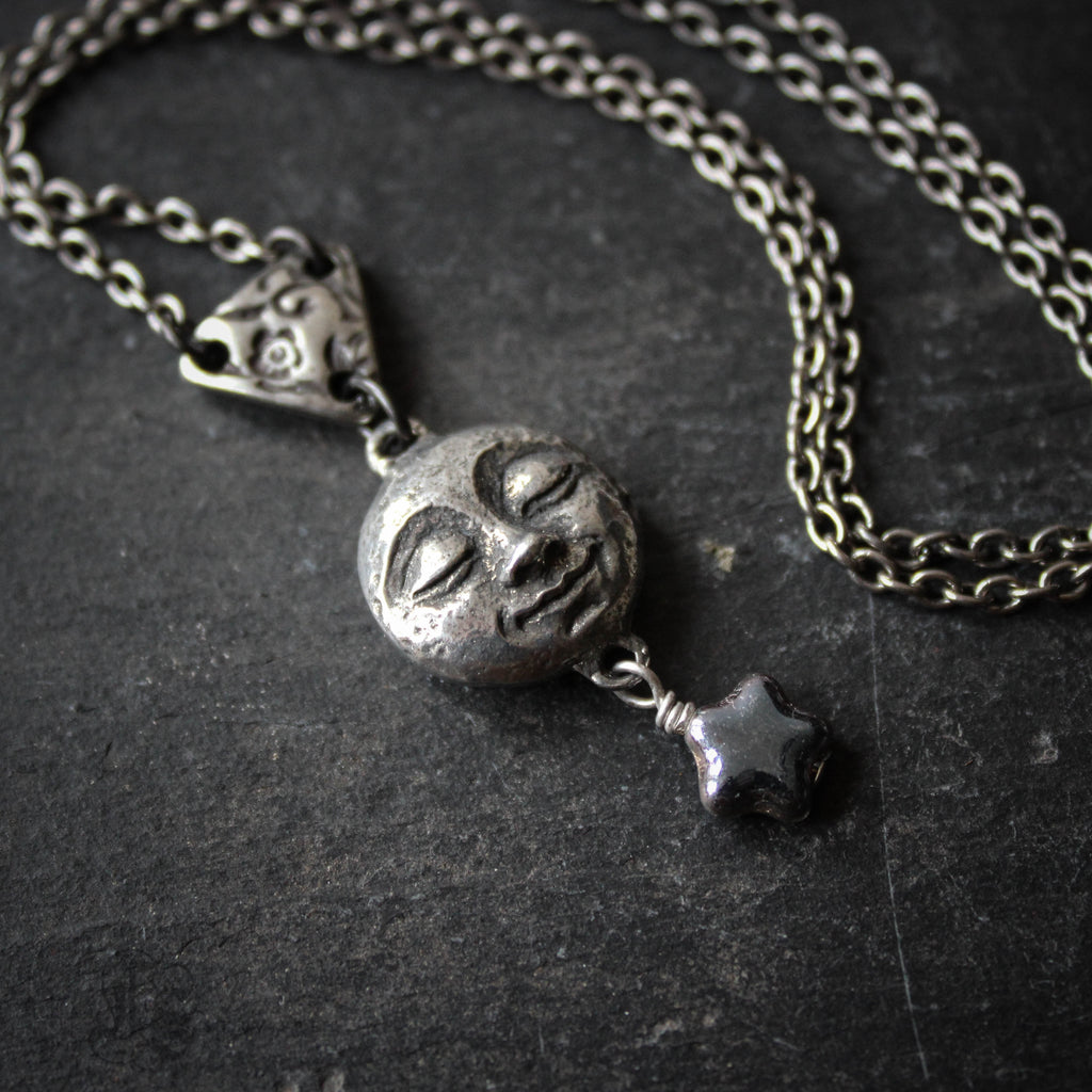 A smiling, pewter moon pendant necklace
