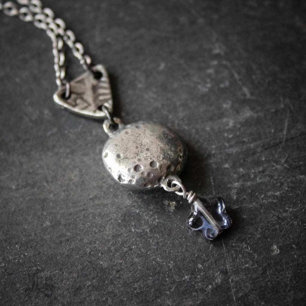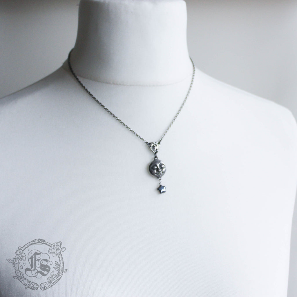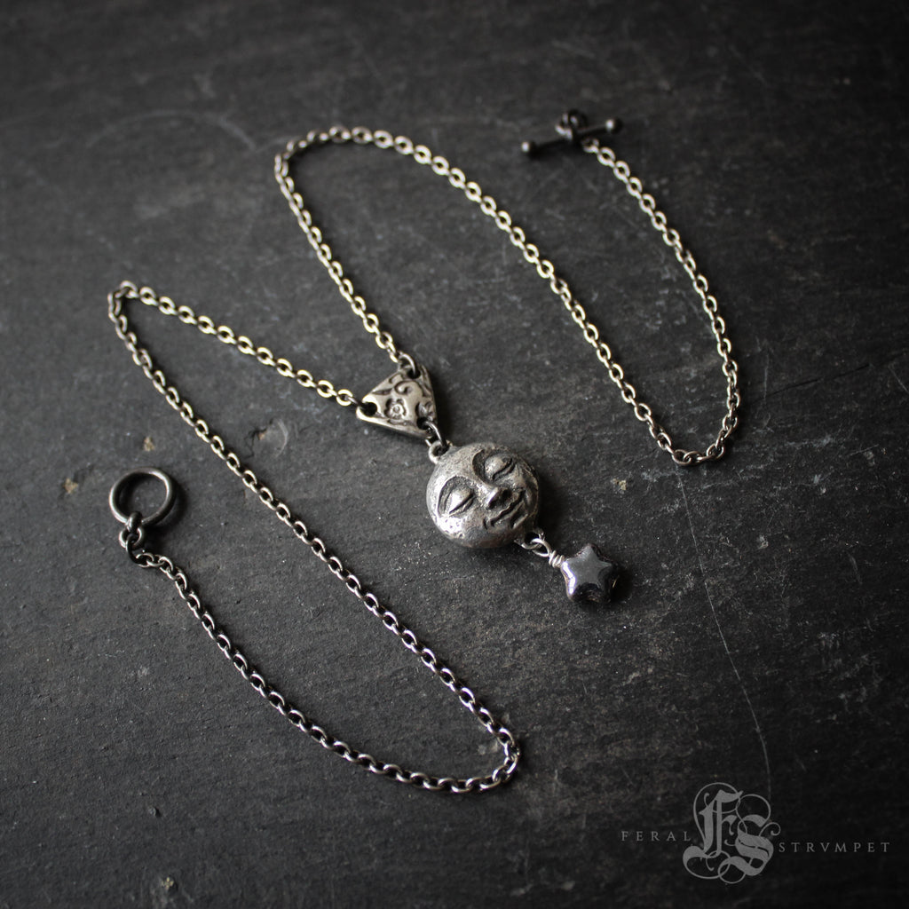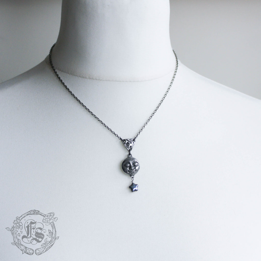 A smiling, pewter moon pendant necklace