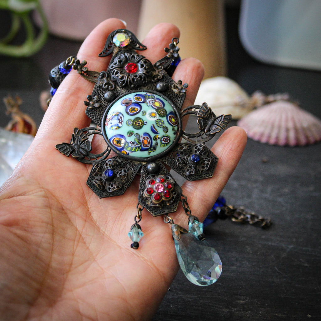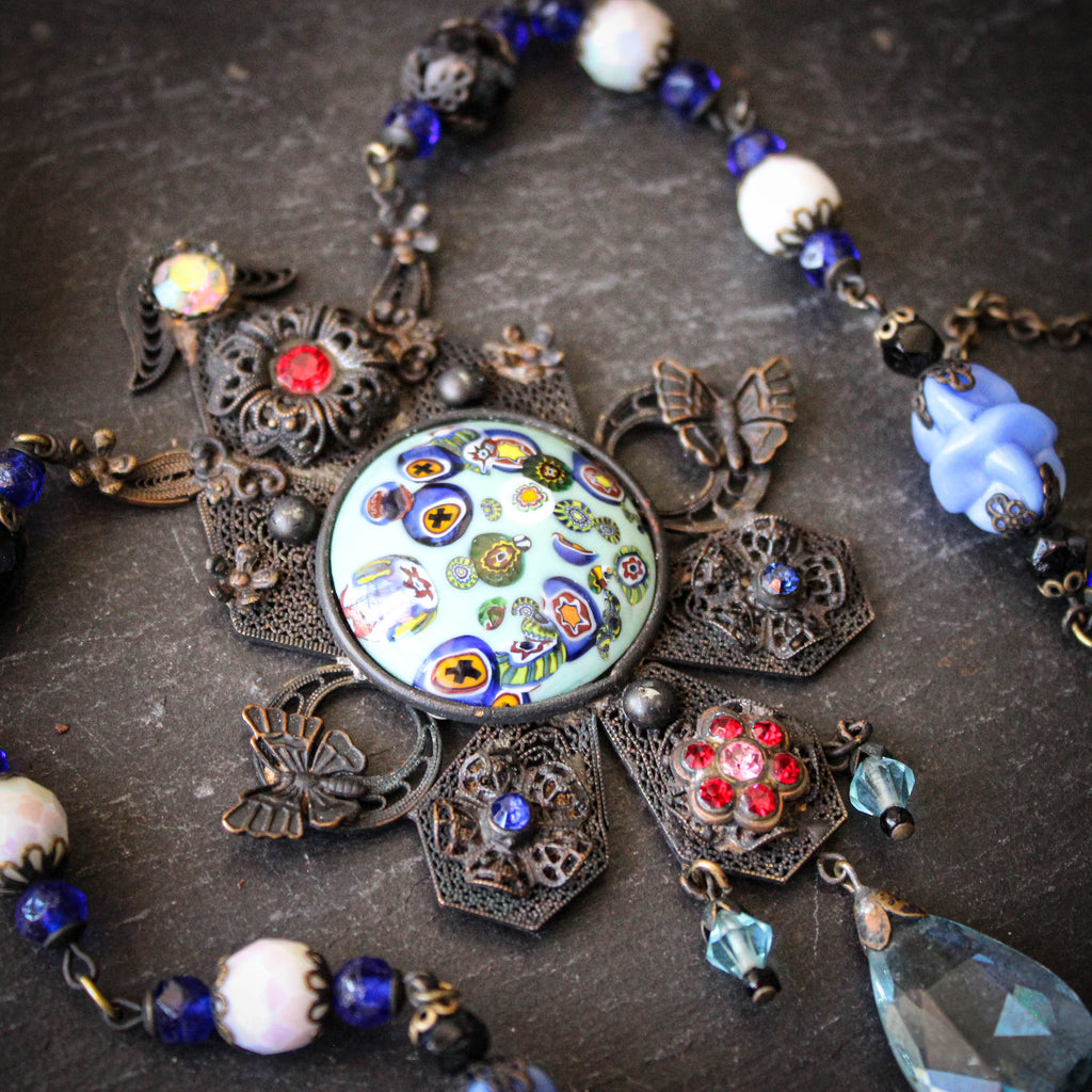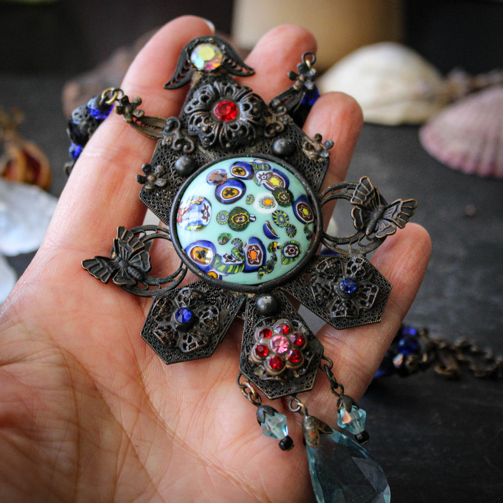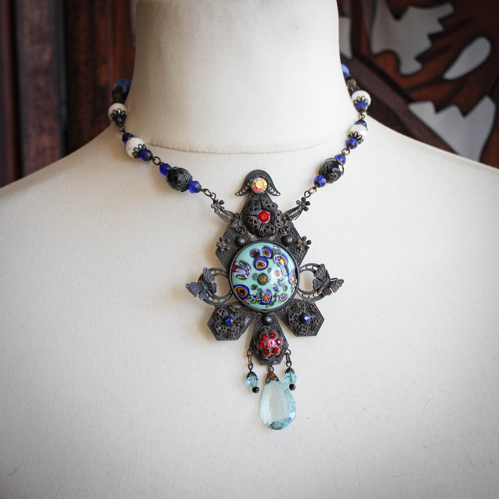A breathtaking statement necklace made of ornate brass filigree and a central millefiori glass cabochon.