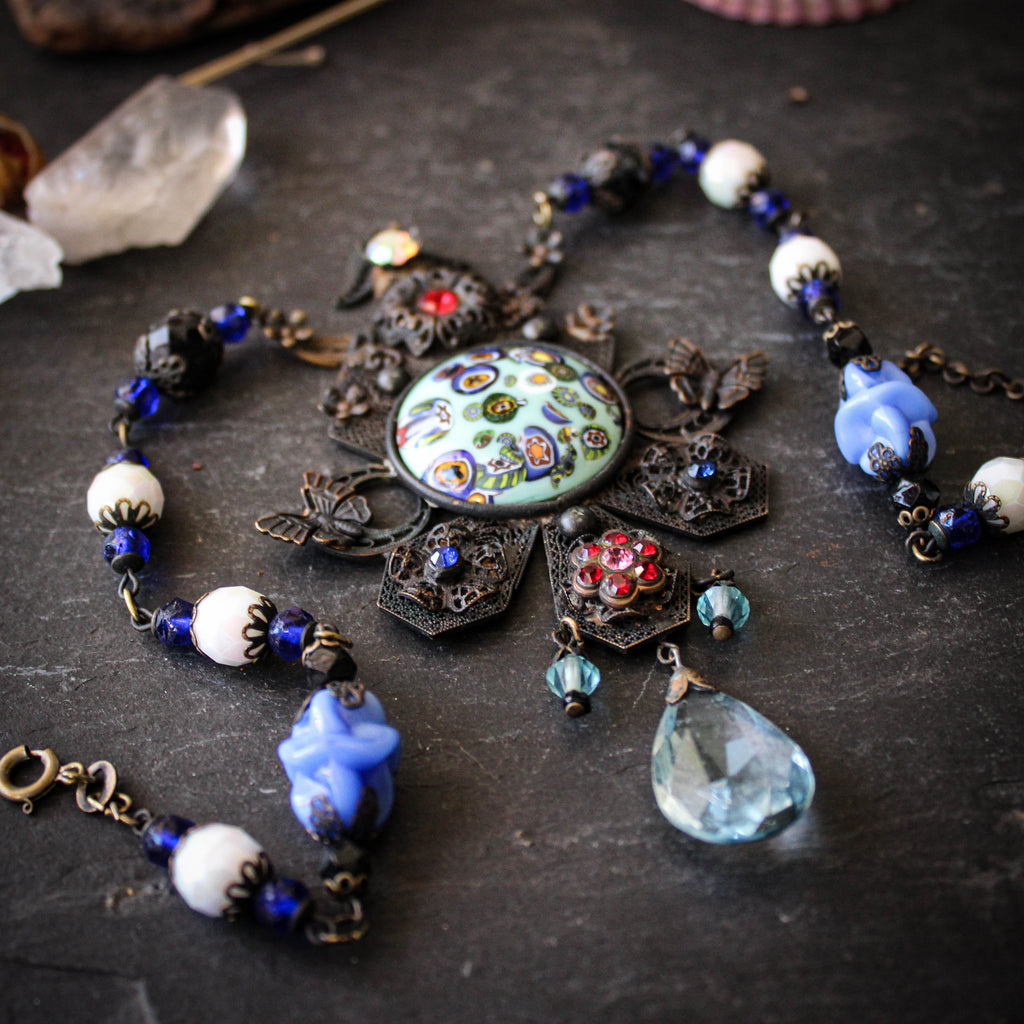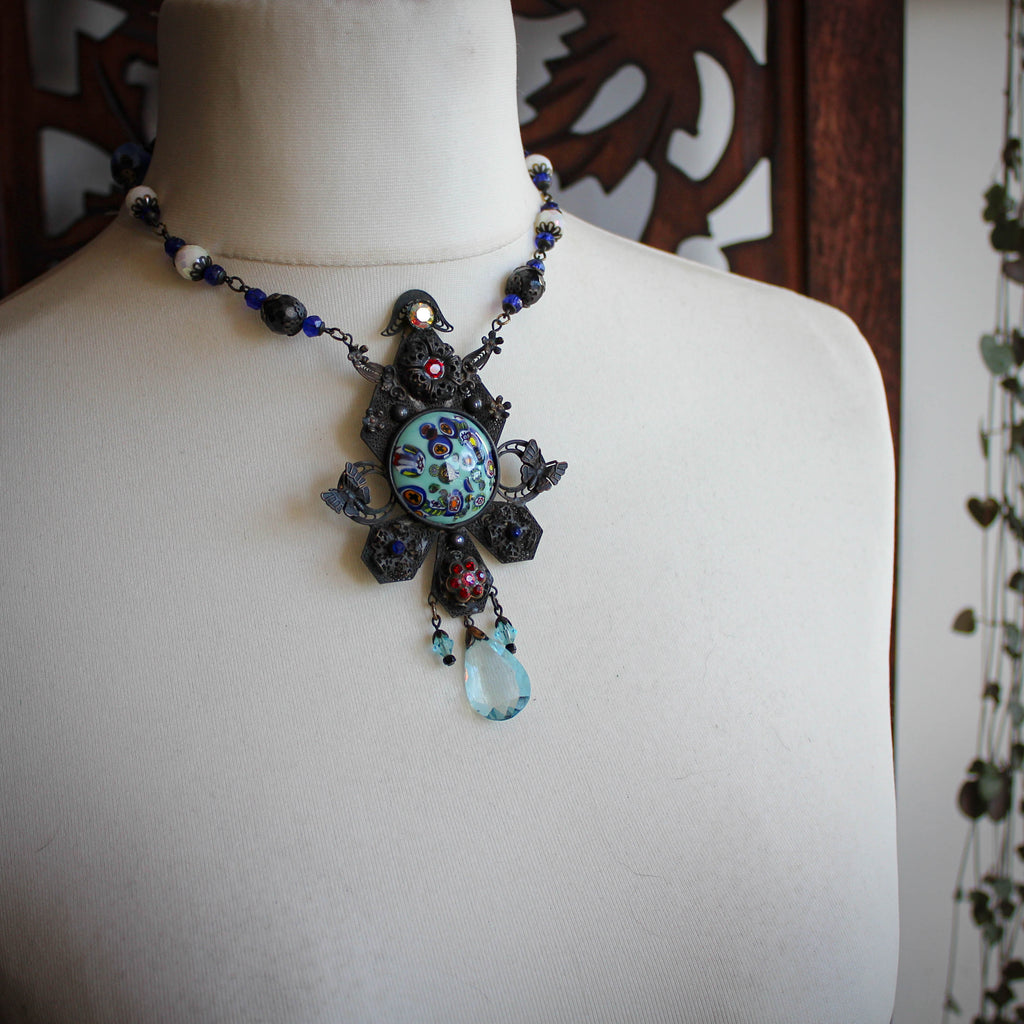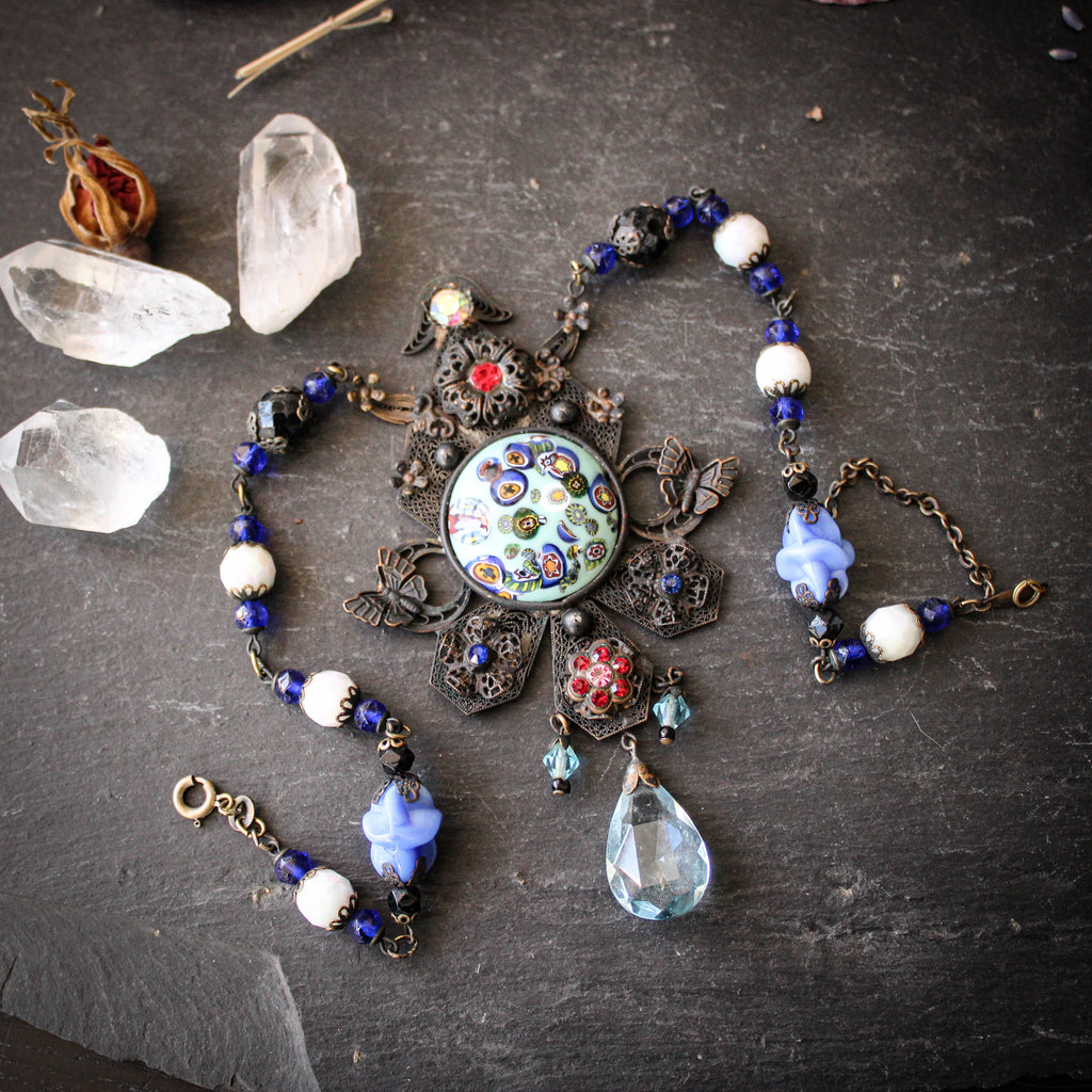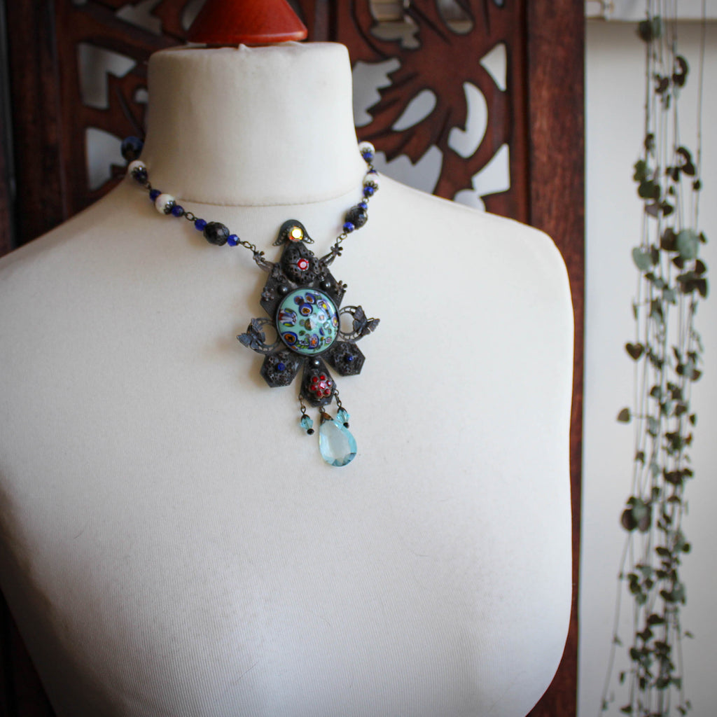 A breathtaking statement necklace made of ornate brass filigree and a central millefiori glass cabochon.