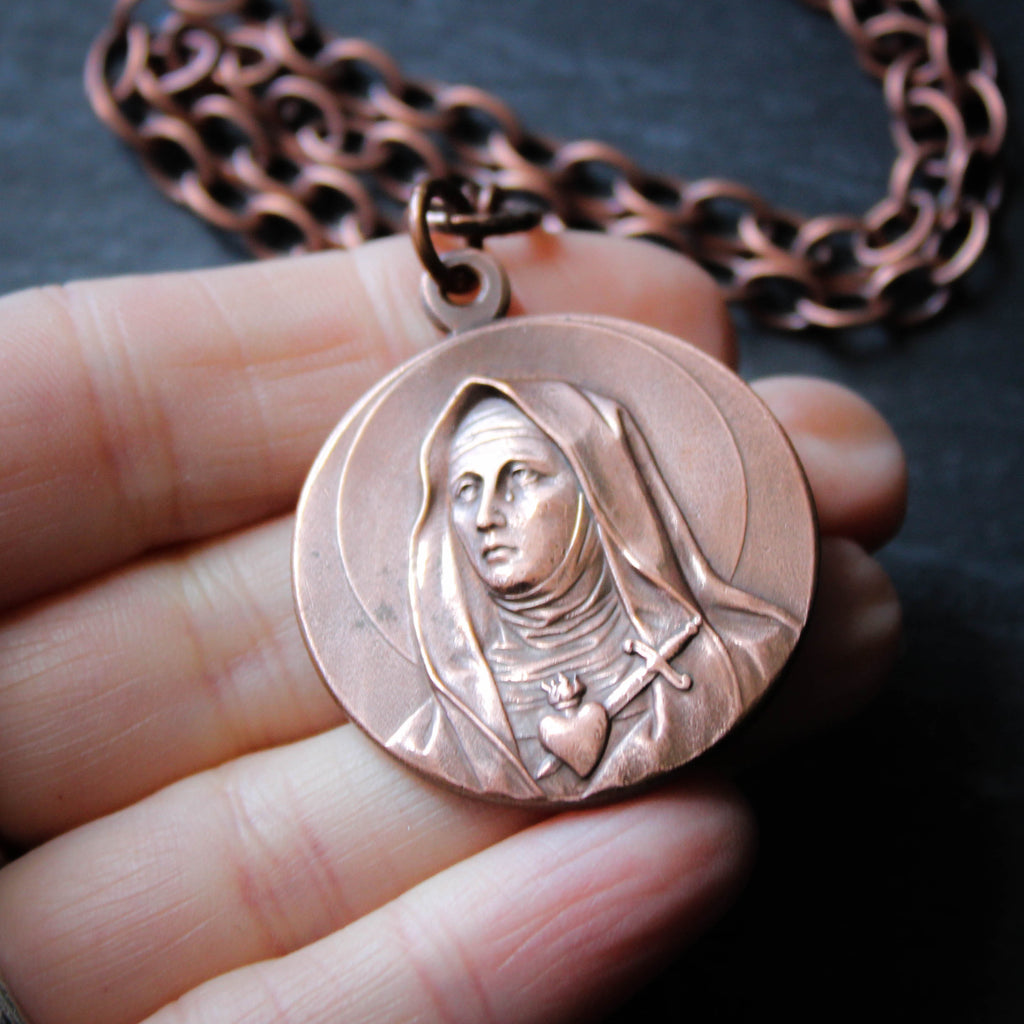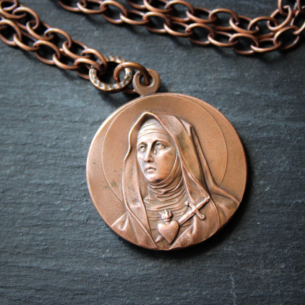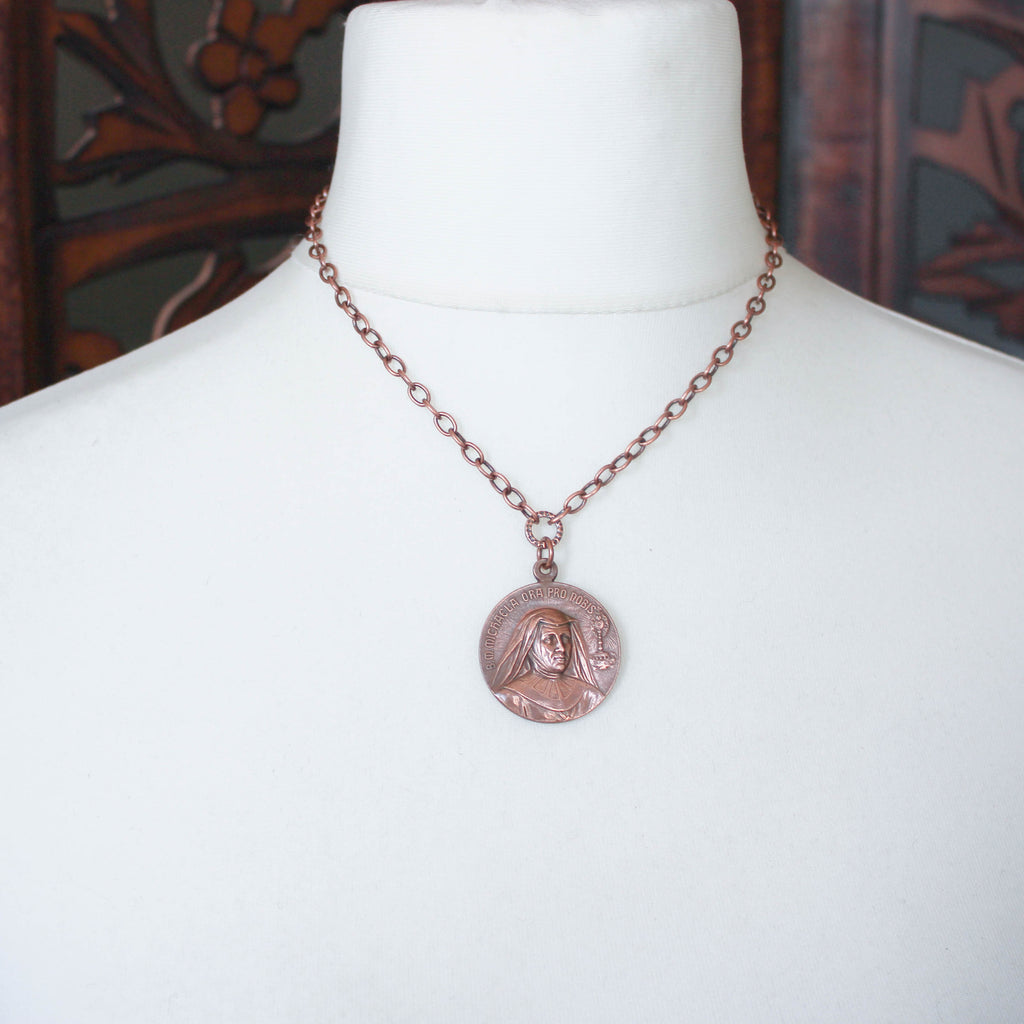 Large Antique Copper Saints Medal Necklace. Saint Maria Micaela Desmaisières and Saint Teresa of Avila.