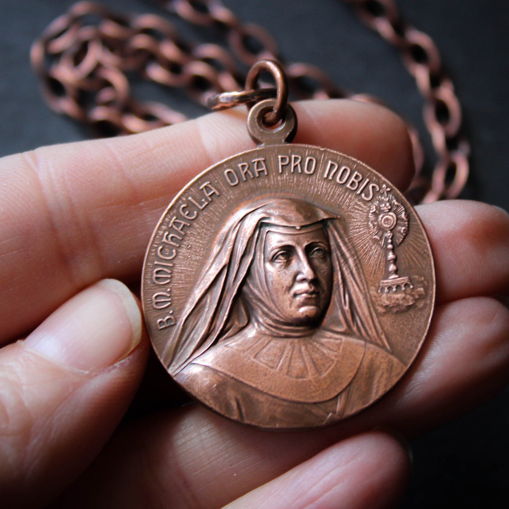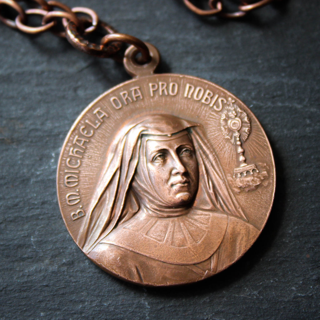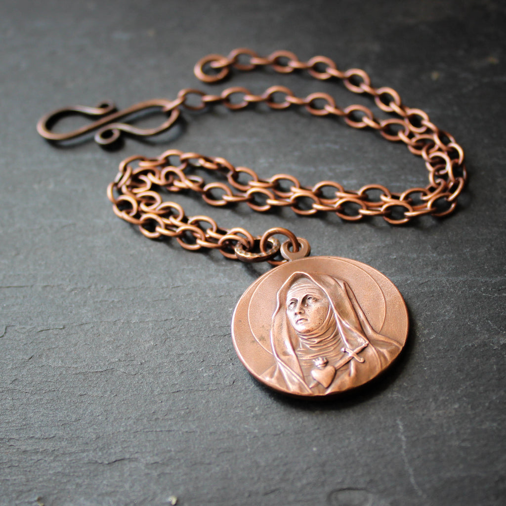 Large Antique Copper Saints Medal Necklace. Saint Maria Micaela Desmaisières and Saint Teresa of Avila.
