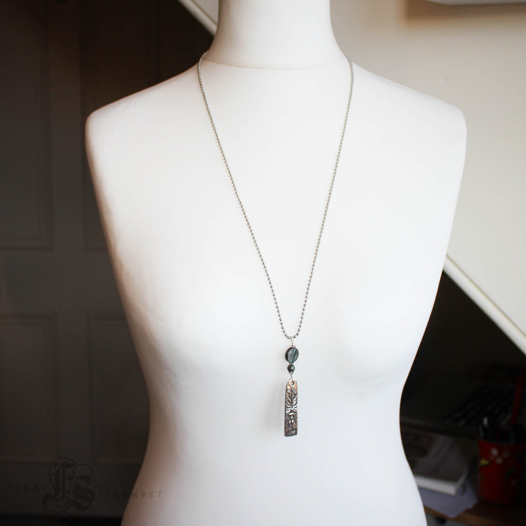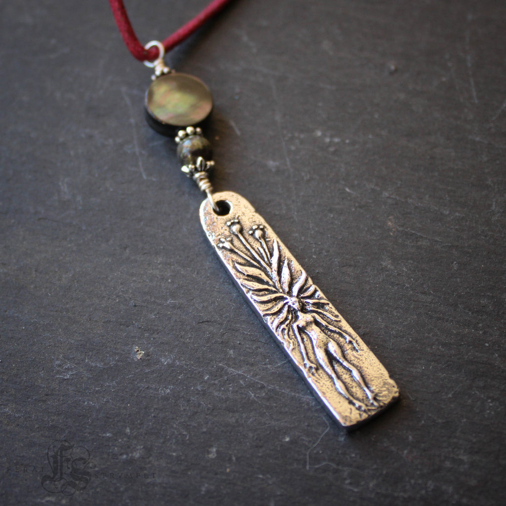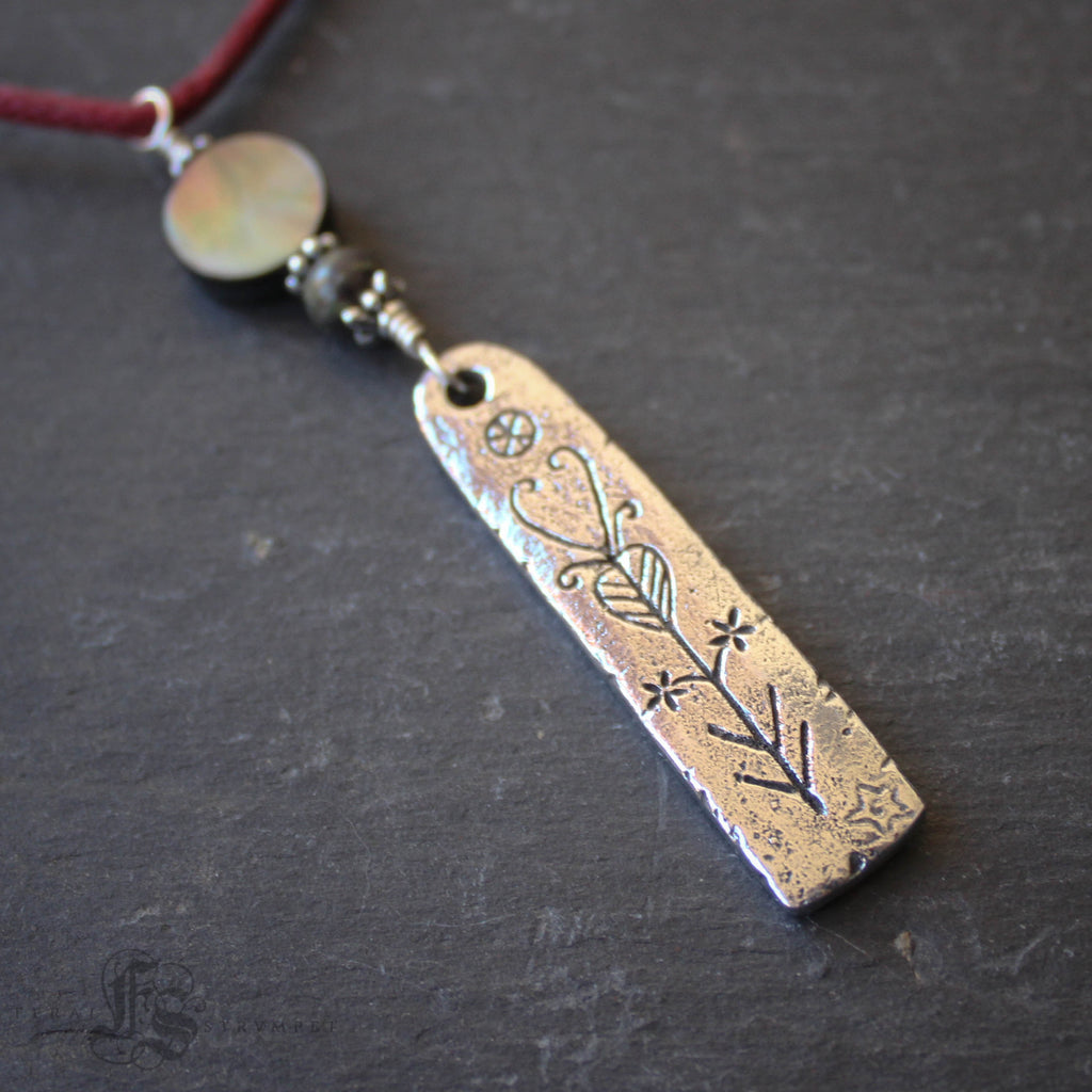 • The pendant hangs from your choice of wine red vegan faux-suede cord or stainless steel ball chain