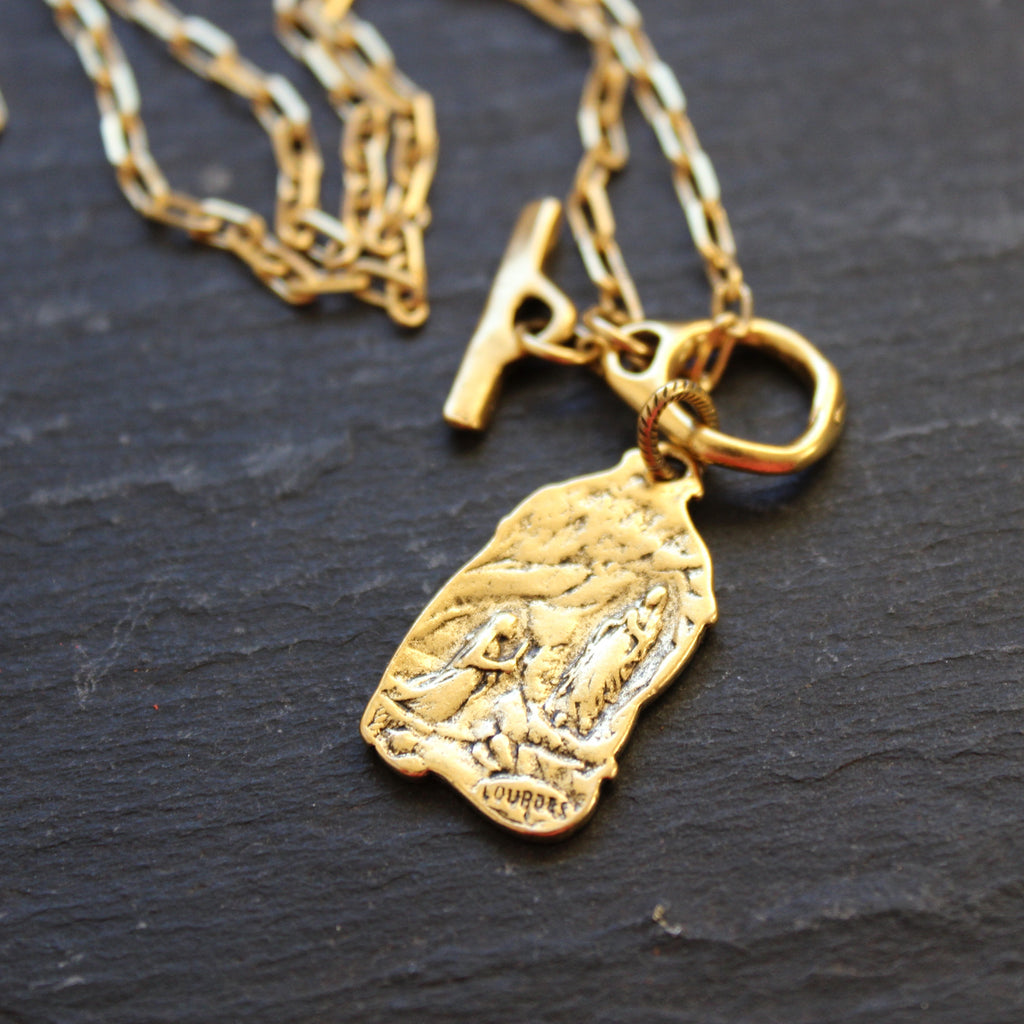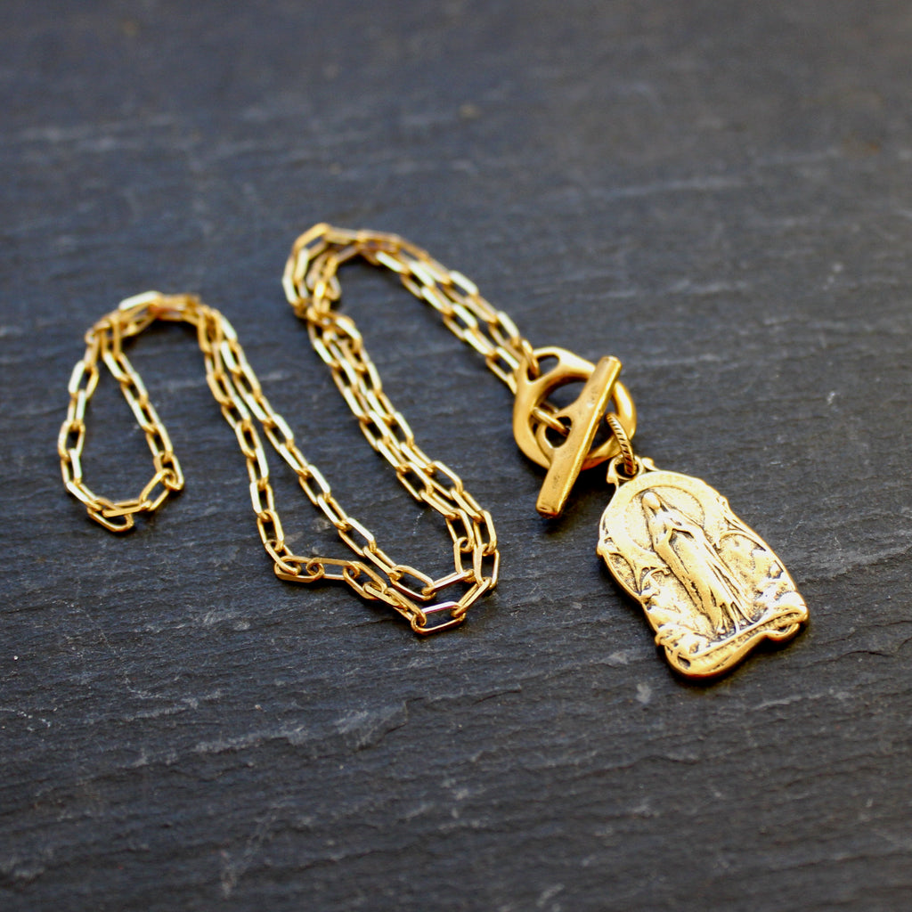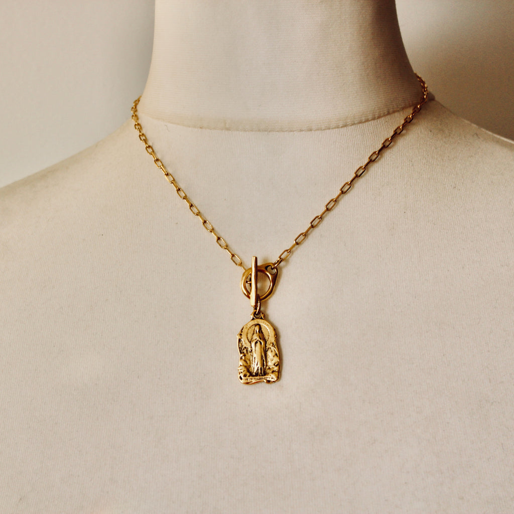 A warm and bold gold plated Lourdes Marian medal with a focal toggle clasp.