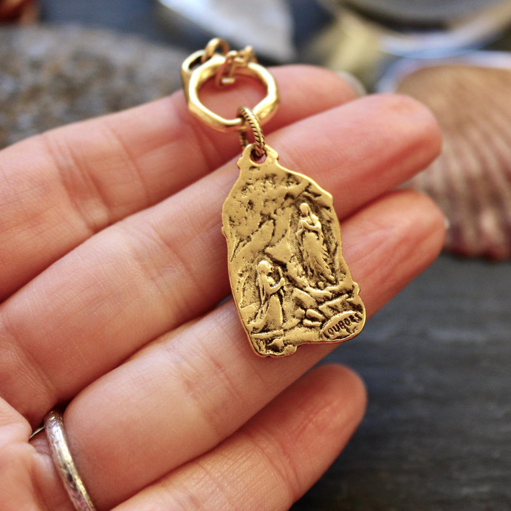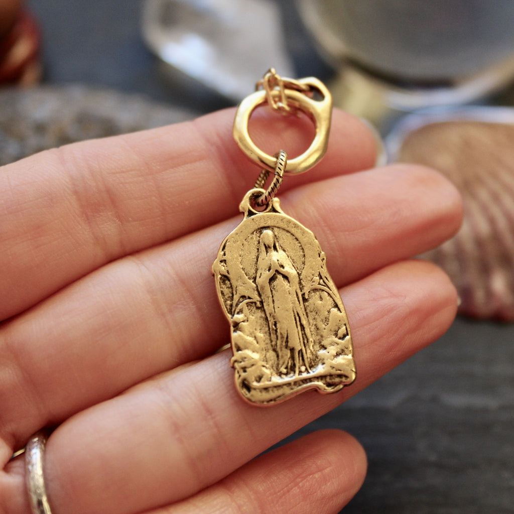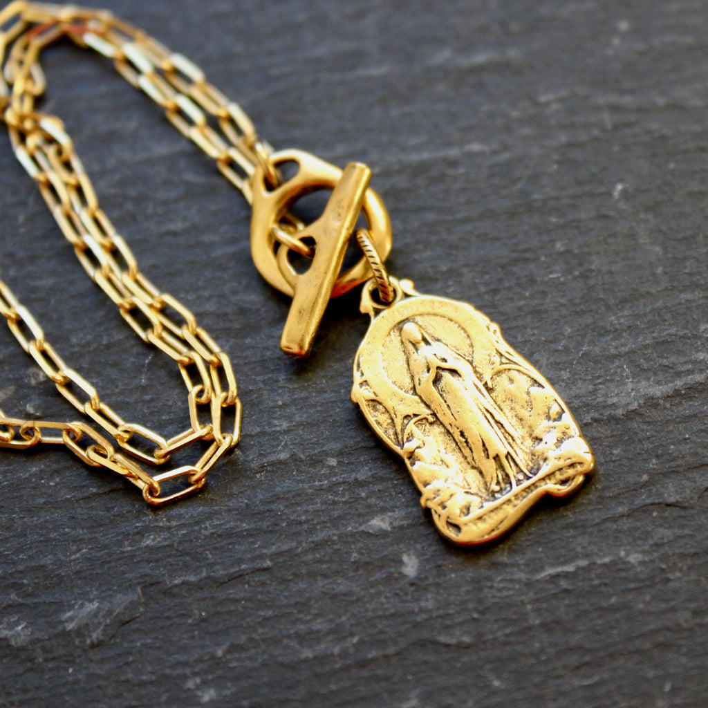 A warm and bold gold plated Lourdes Marian medal with a focal toggle clasp.