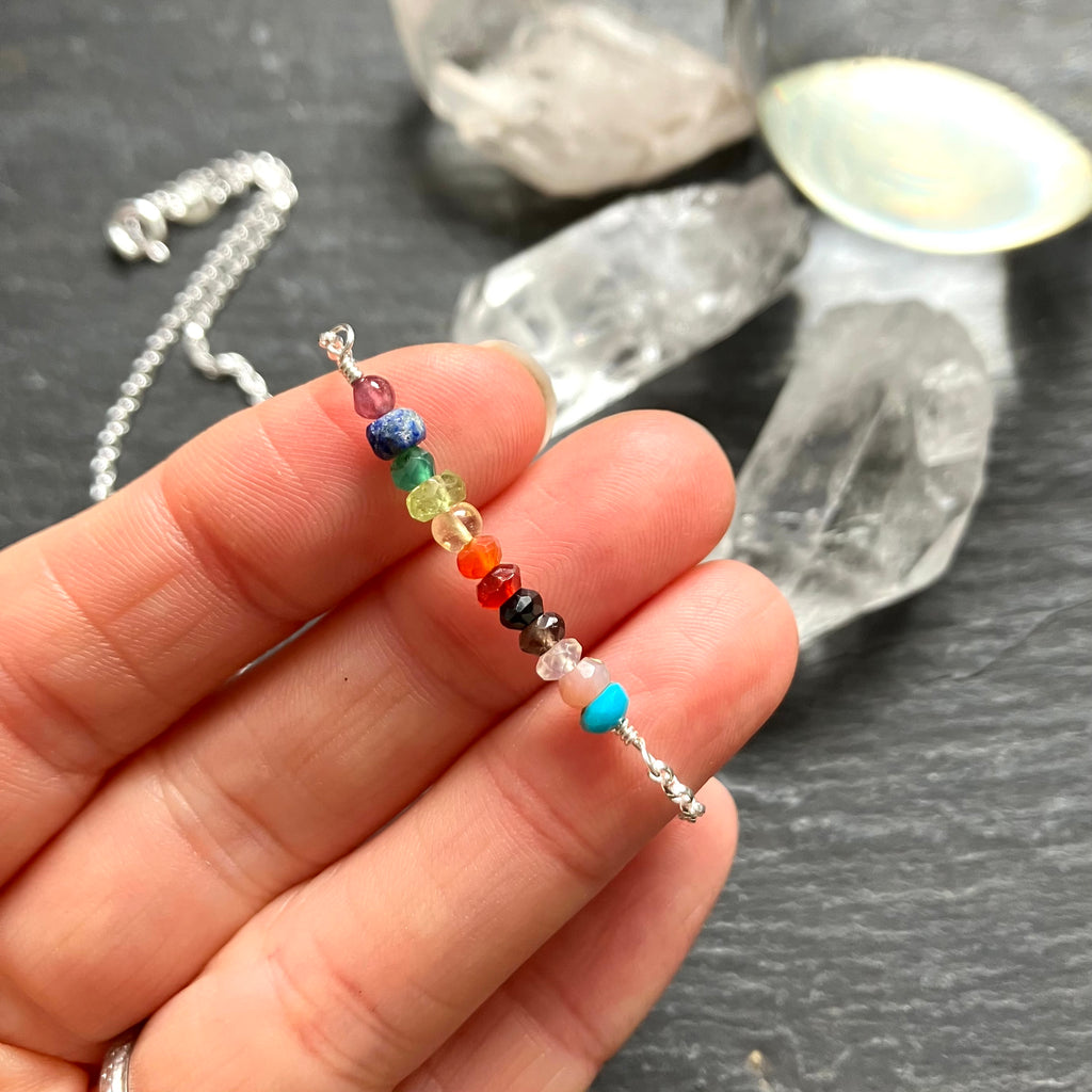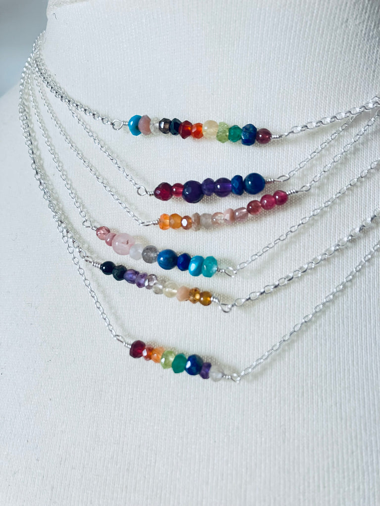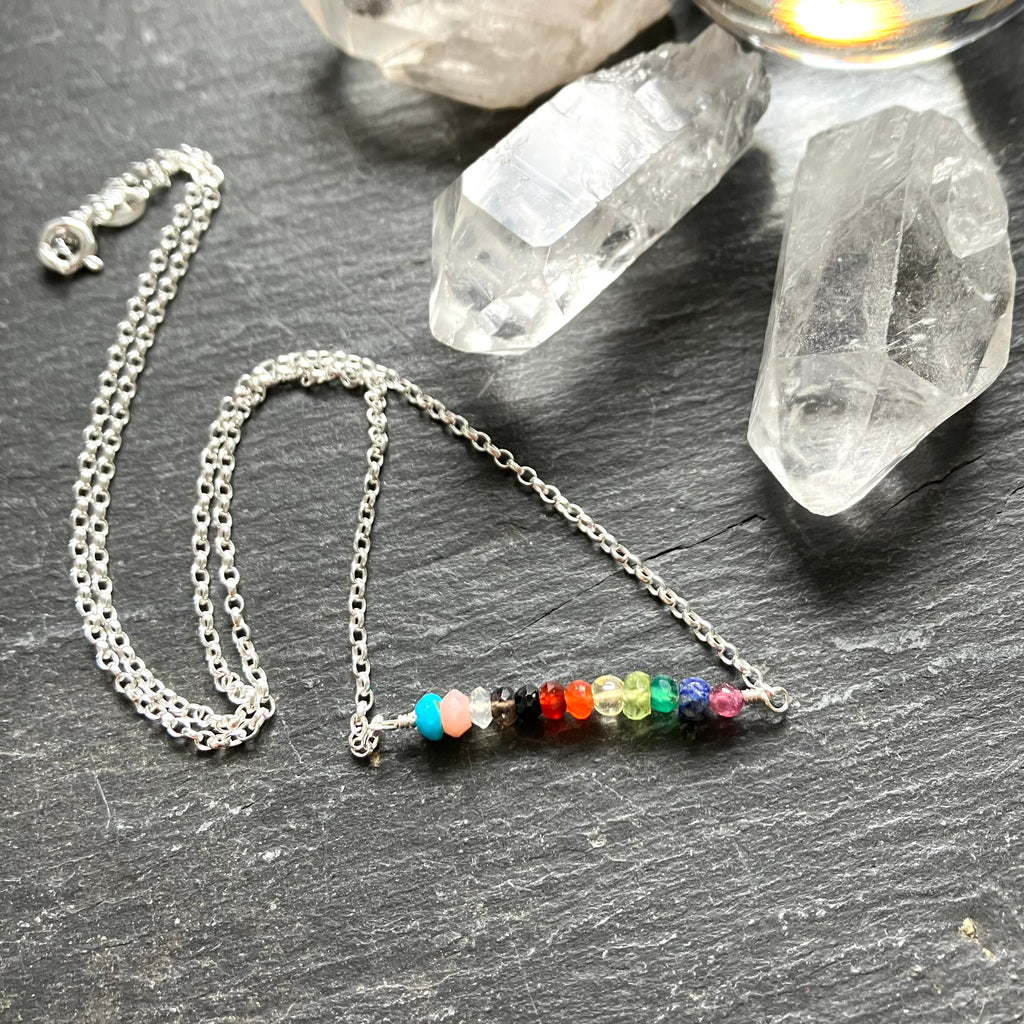 - Garnet, tourmaline, aventurine, peridot, carnelian, rhodonite, amethyst, lapis, sodalite, and Sleeping Beauty turquoise form a tiny ombre pendant in the colours of the Progress Flag