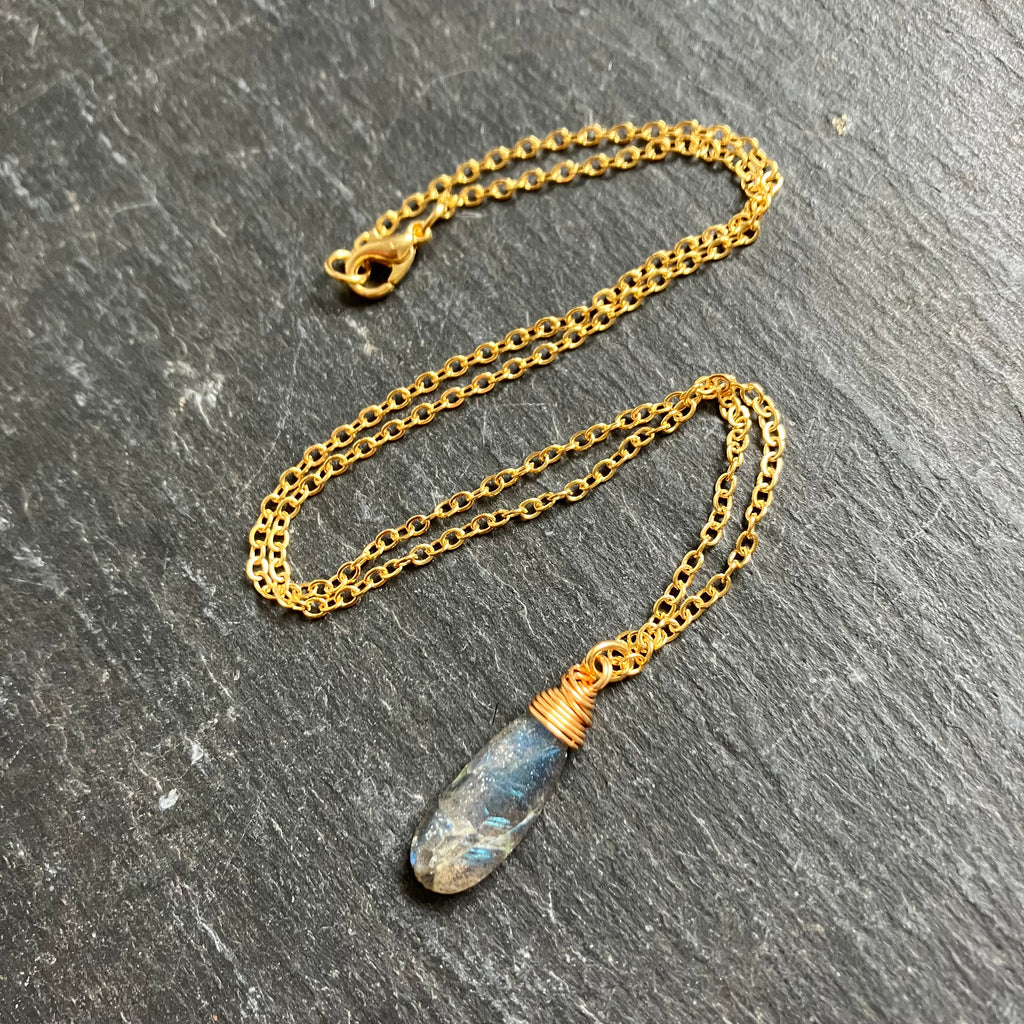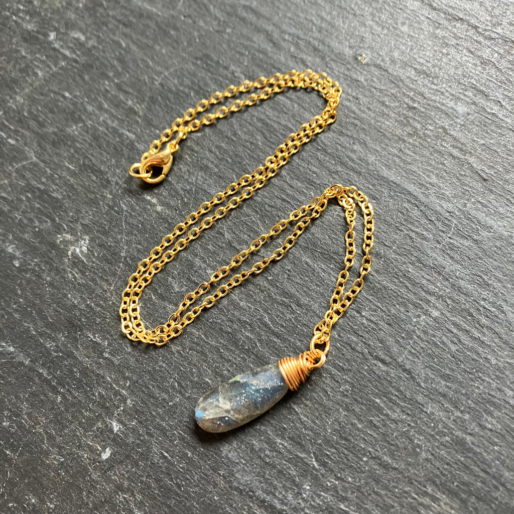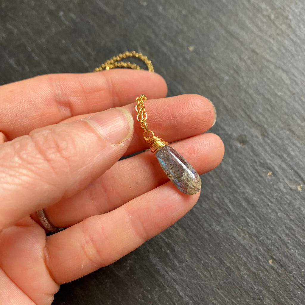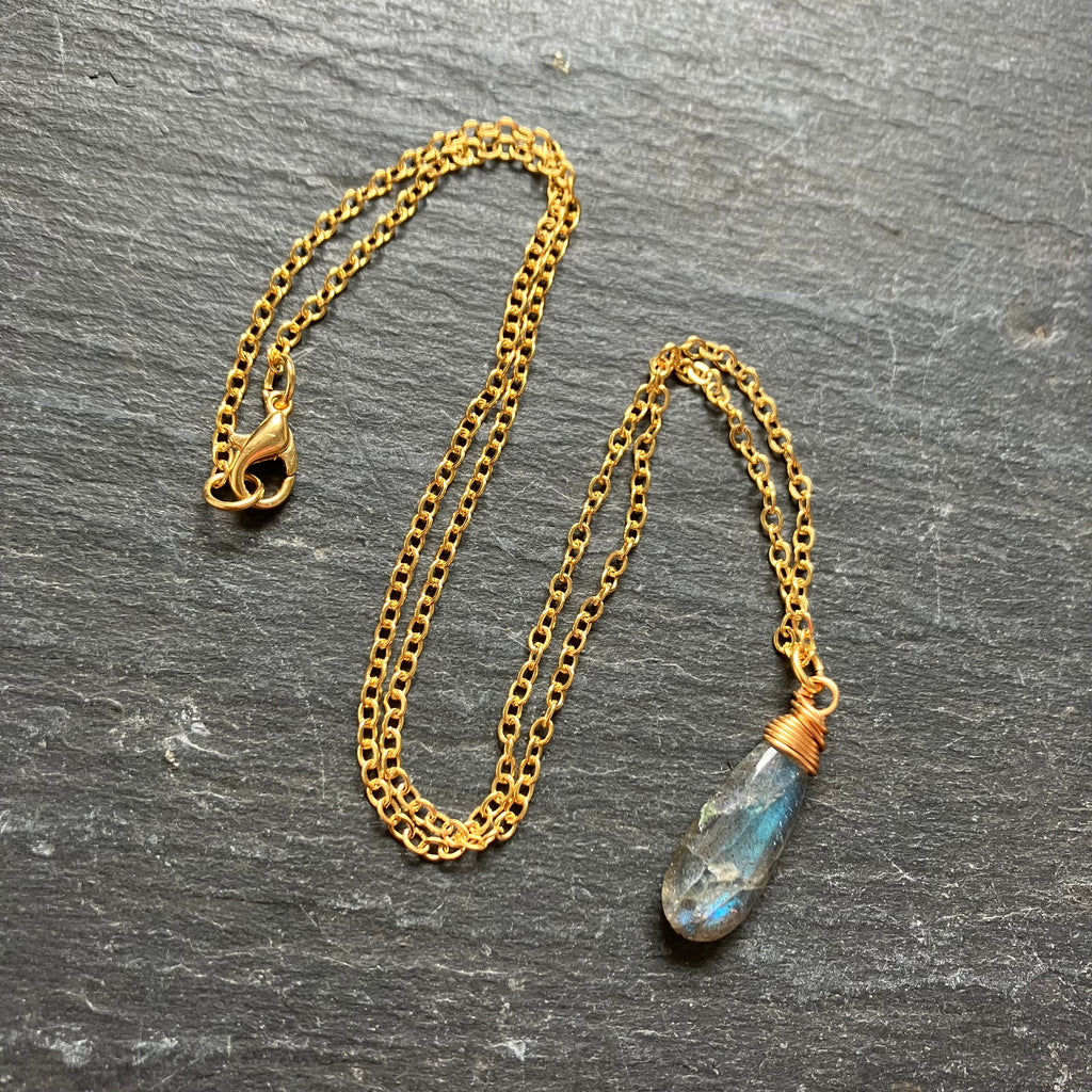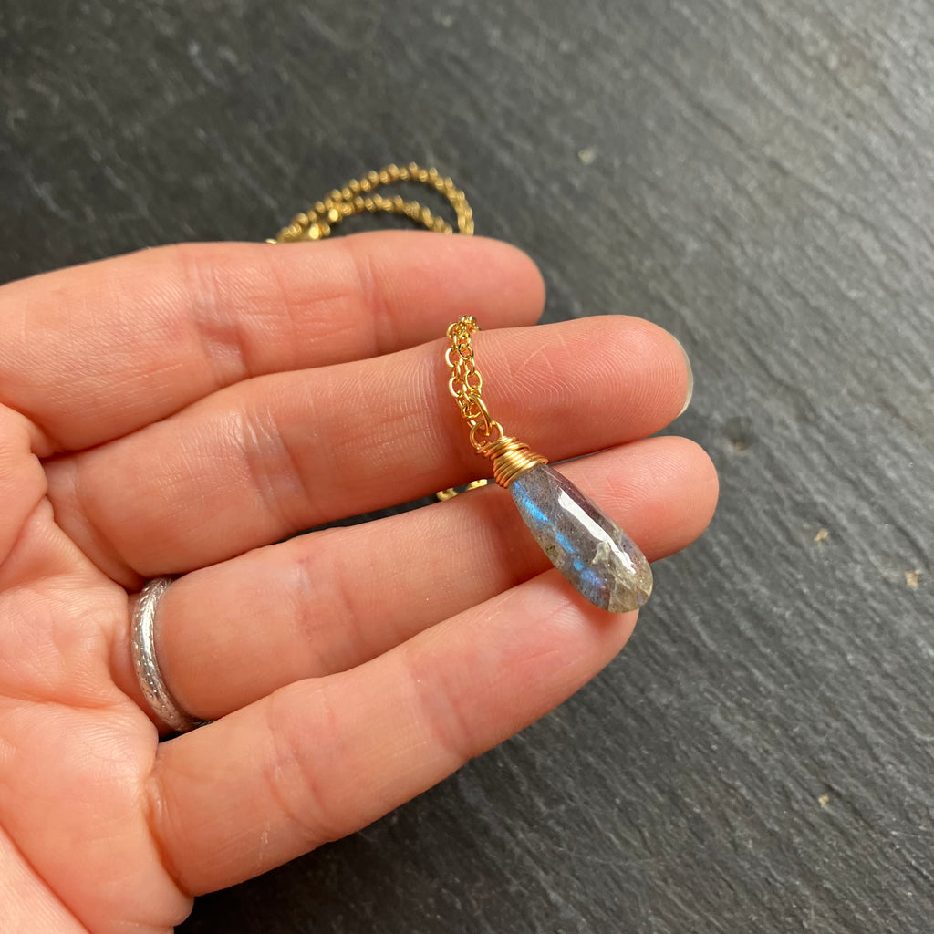 A delicate, simple everyday necklace with a lush labradorite drop on a warm gold plated chain.