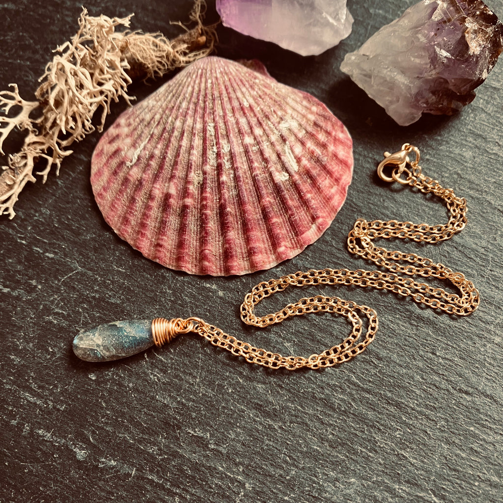 - Wrapped with gold plated wire and hangs from a gold plated chain that closes with a gold plated lobster style clasp