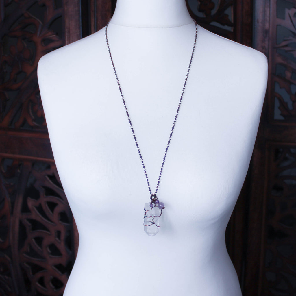 A raw crystal quartz point wire wrapped in copper, with three little amethyst orb accents.