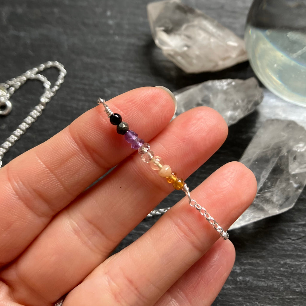 - tourmaline, citrine, crystal quartz, and amethyst, form a tiny ombre pendant in the colours of the Nonbinary Flag