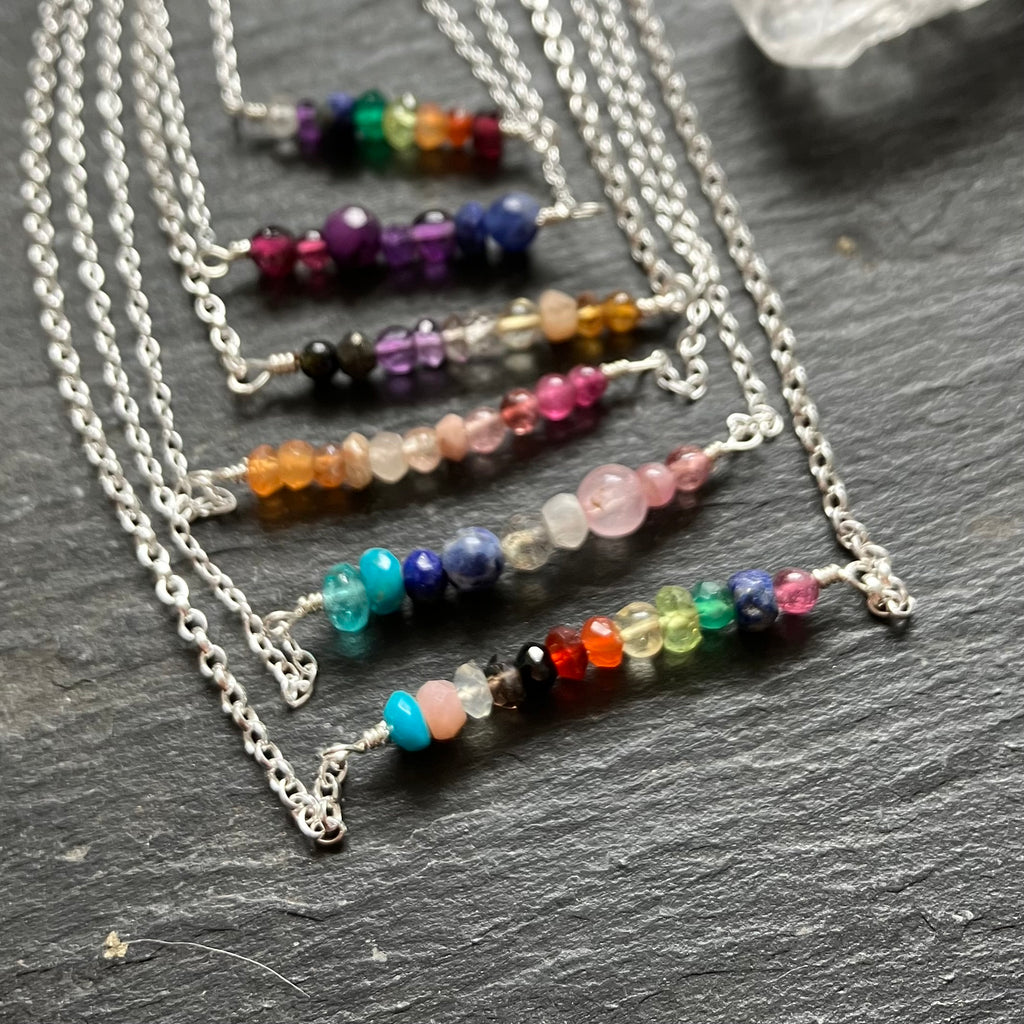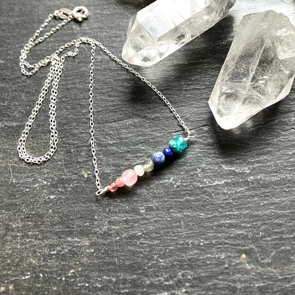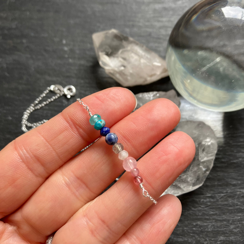 - Tourmaline, labradorite, lapis, rhodonite, rose quartz, apatite, flourite, amethyst, lapis, sodalite, and Sleeping Beauty turquoise form a tiny ombre pendant in the colours of the Trans flag