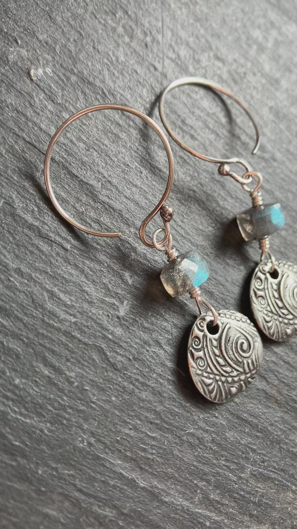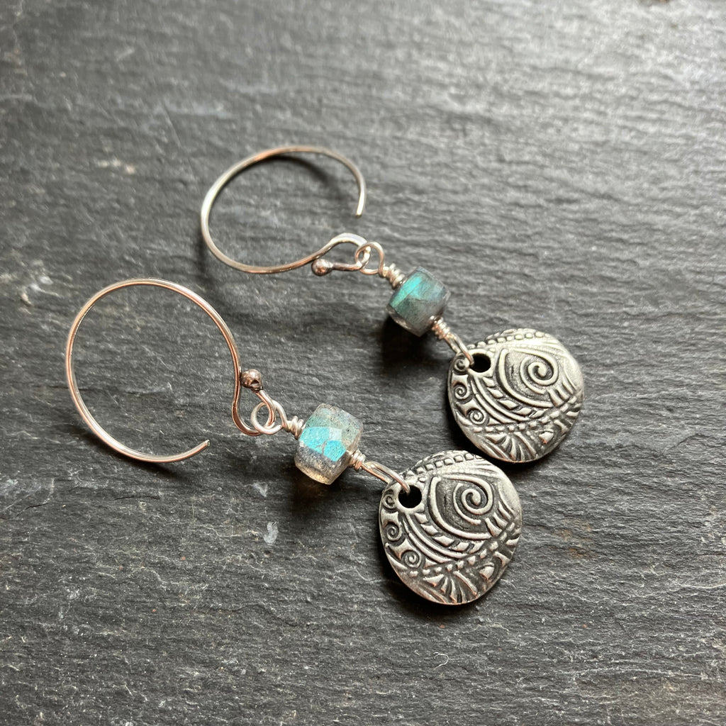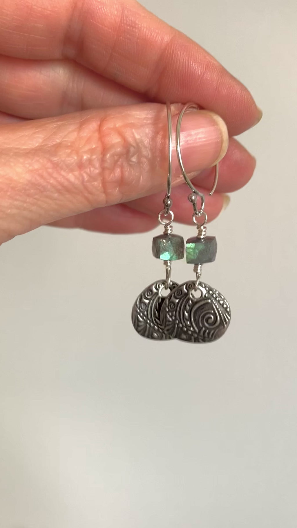 Delicate everyday earrings made of sterling silver, pewter and labradorite are full of mystery and movement.