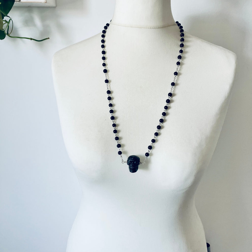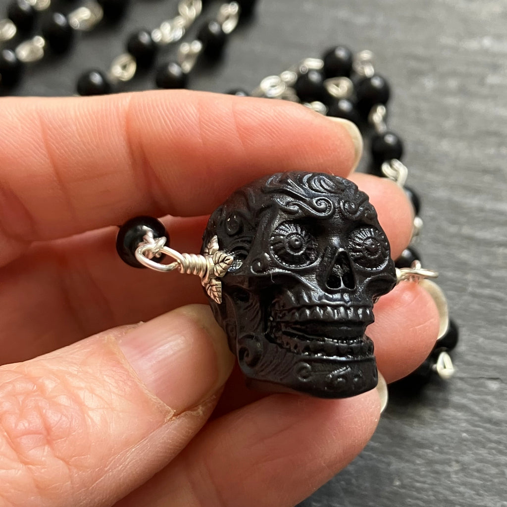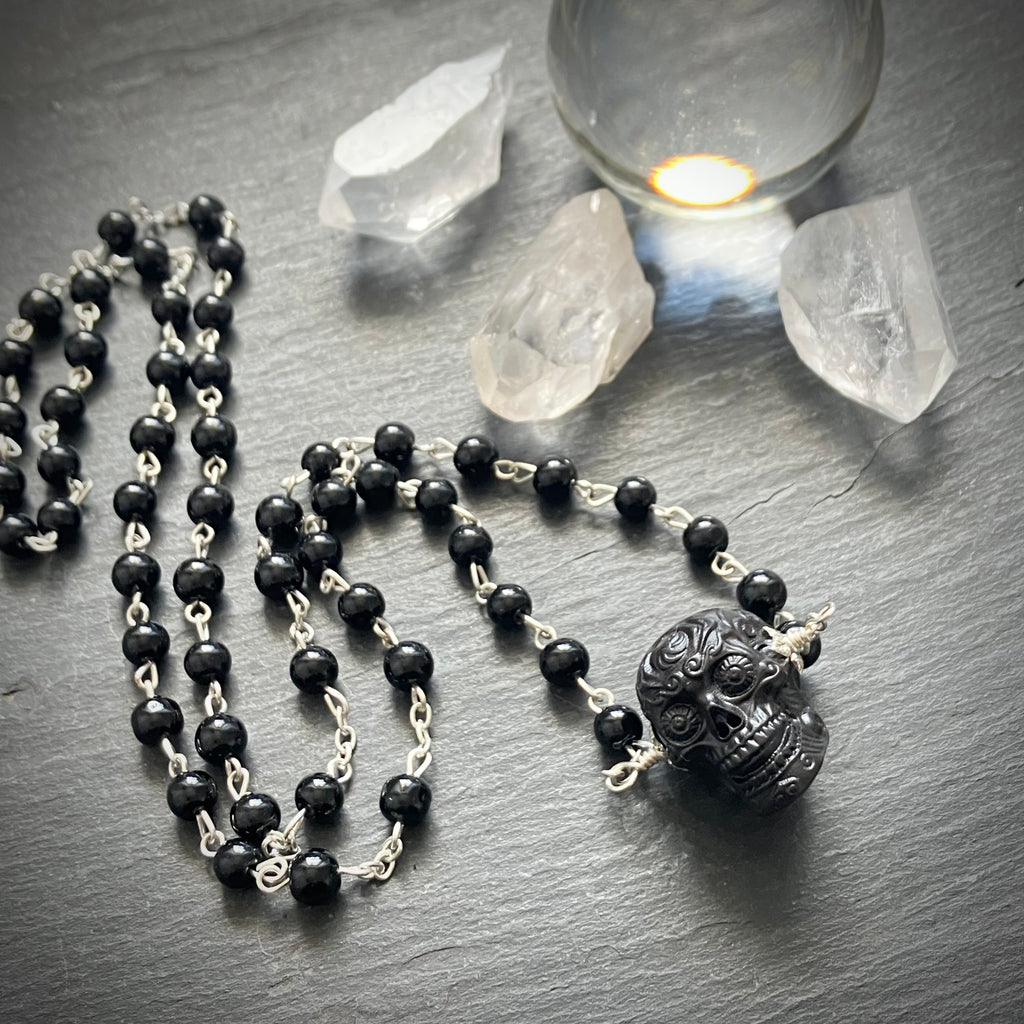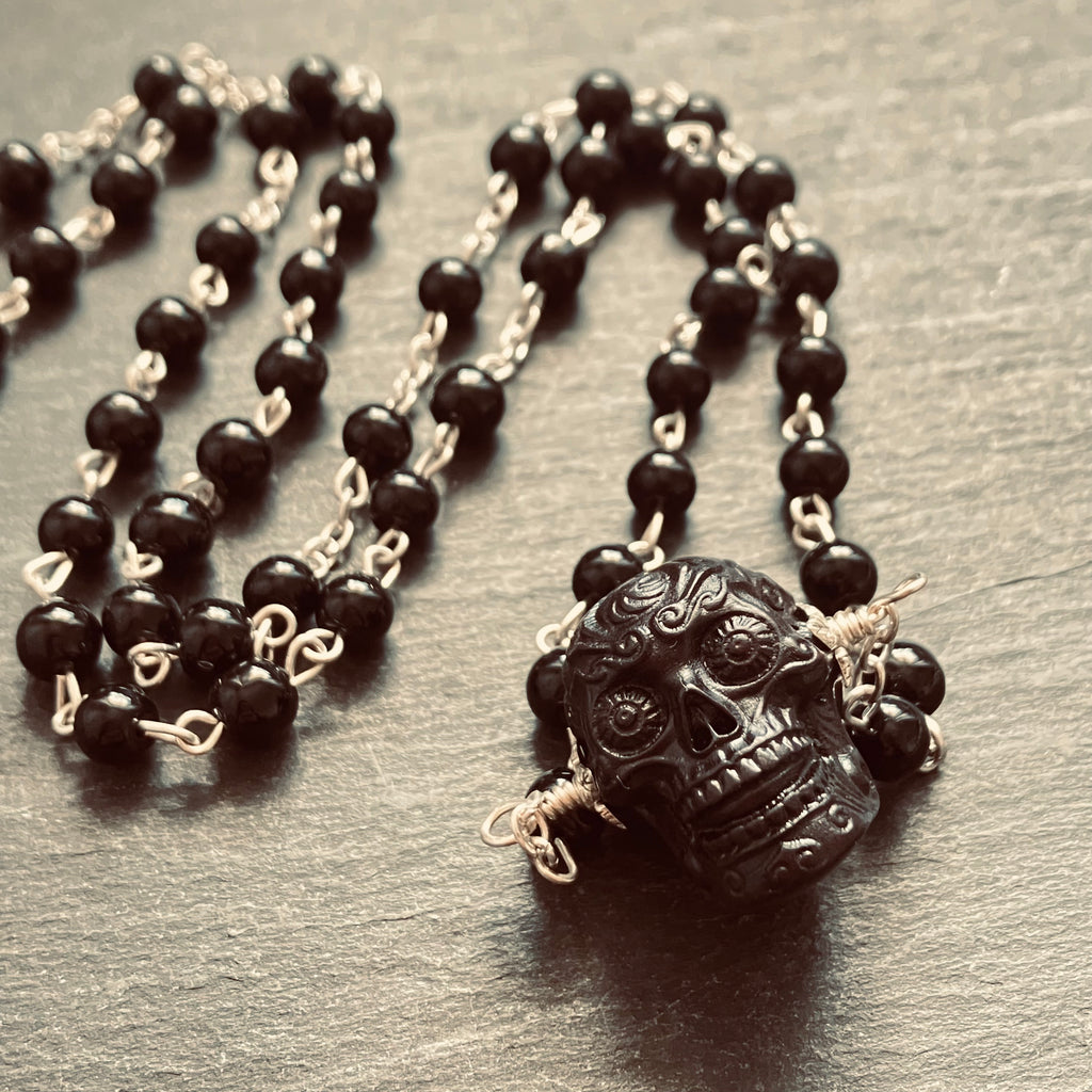 A grinning, adorned skull to keep you company, strung from a trad goth, beaded rosary chain.