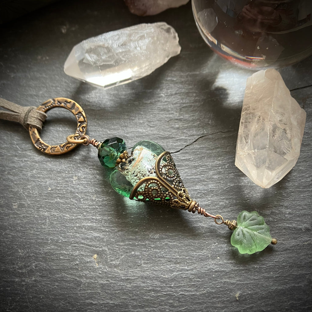 - It hangs from an algae green vegan suede cord measuring 30" or 76cm