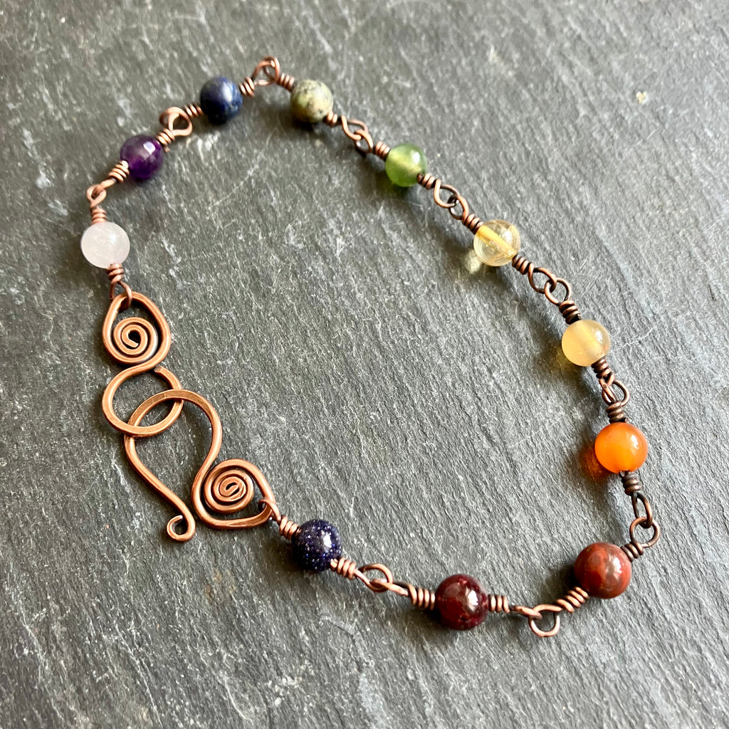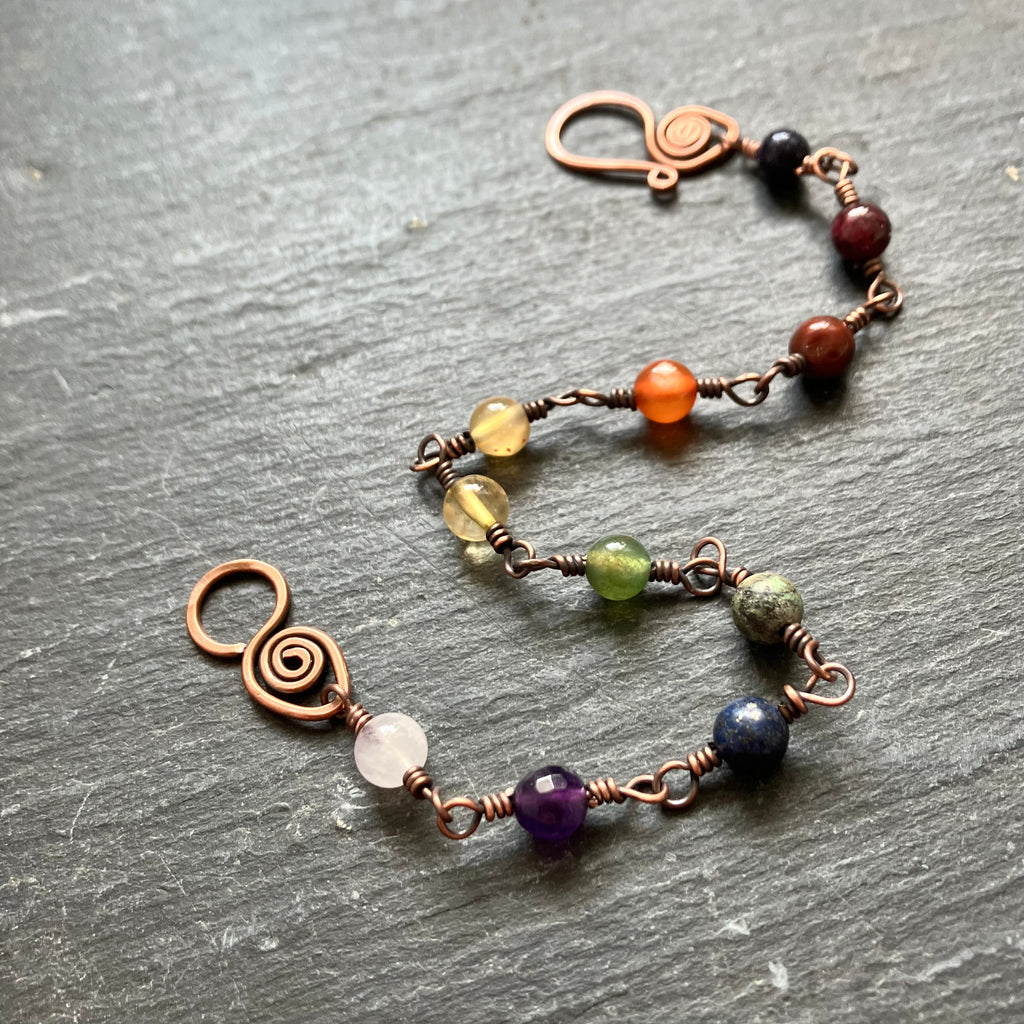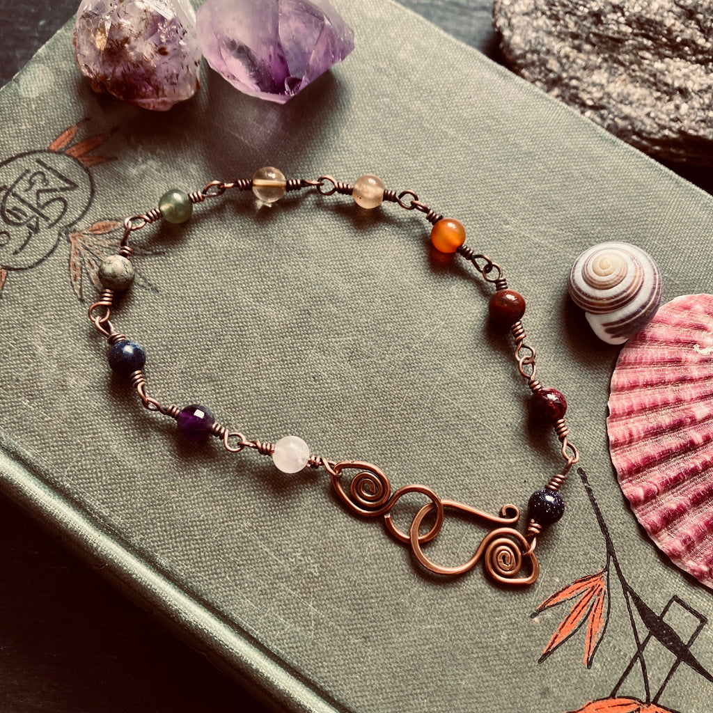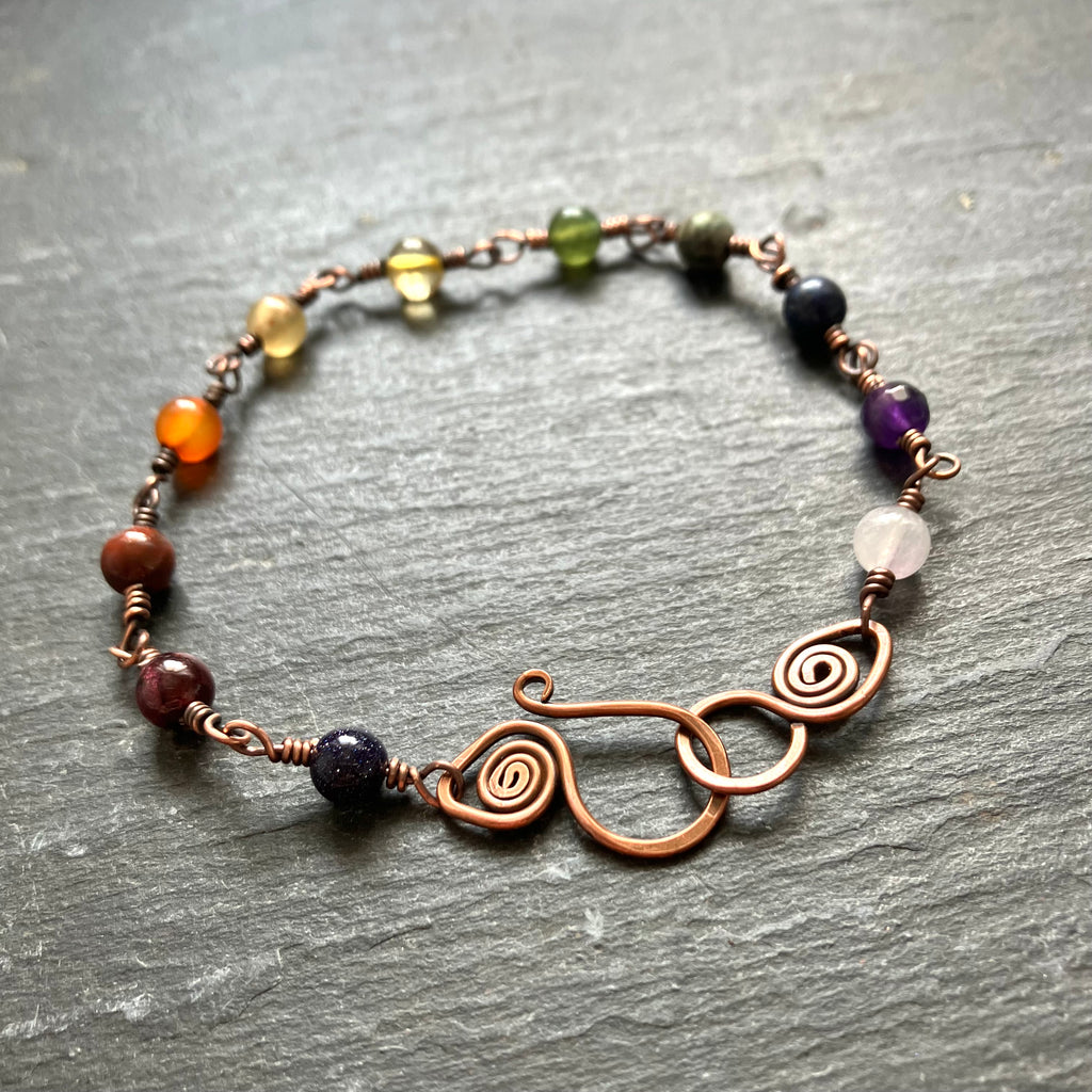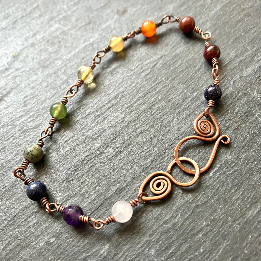 A large wrapped link copper bracelet with a rainbow array of semi-precious stone beads.