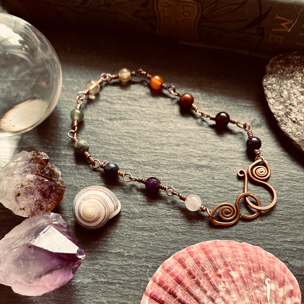 This witches' ladder bracelet is inspired by knot spell work and pagan rosary chains, hand wrapped on rosary style links in copper, one bead at a time, and my intention is always gratitude and peace as I make these.